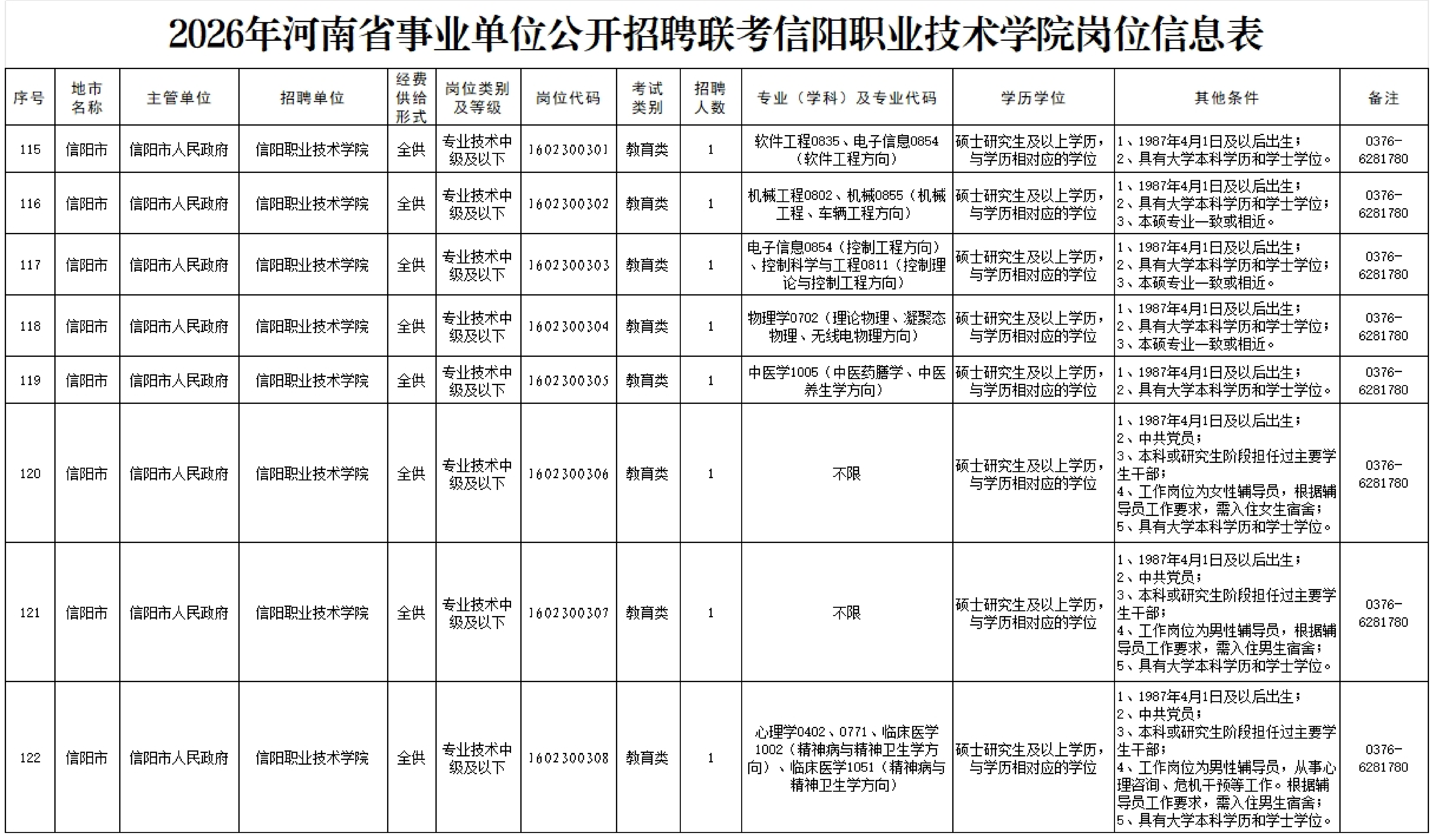 信阳市共有70个事业单位参加此次联考,计划招聘工作人员400名,具体事业单位、招聘岗位、人数、条件、联系电话等相关信息详见《2026年河南省事业单位公开招聘联考岗位信息表(信阳市)》(附件2)。