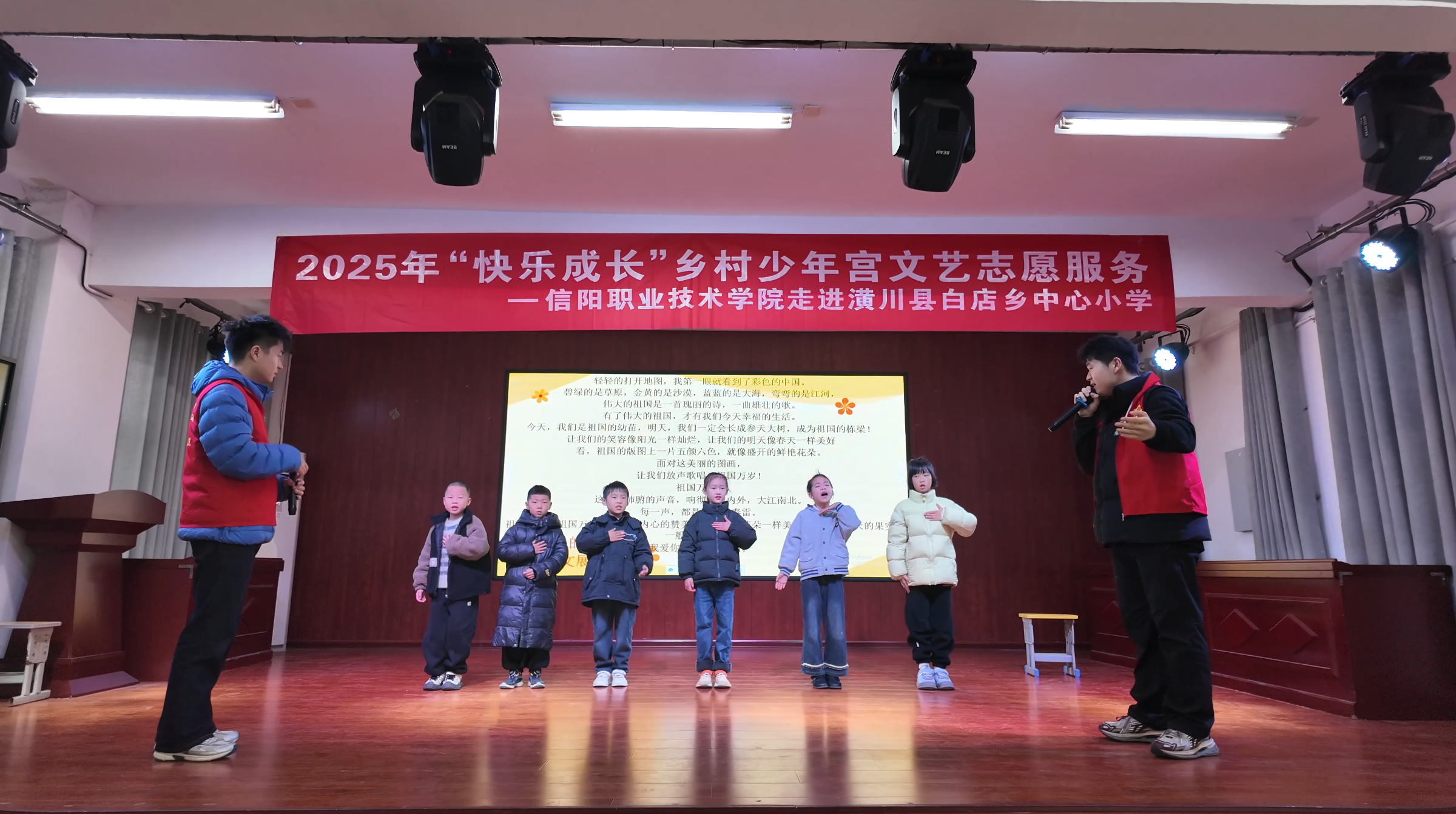 本次活动是我校乡村少年宫文艺志愿服务的持续深化。语言与传媒学院的志愿者们充分发挥专业优势,将趣味游戏、绕口令互动与经典诵读巧妙融合,为孩子们带来了一堂堂生动的普通话推广课。志愿者们还精心指导孩子们排练散文诗《繁星》朗诵,在琅琅诗声中引领他们感受韵律之美,播撒规范使用普通话的种子。