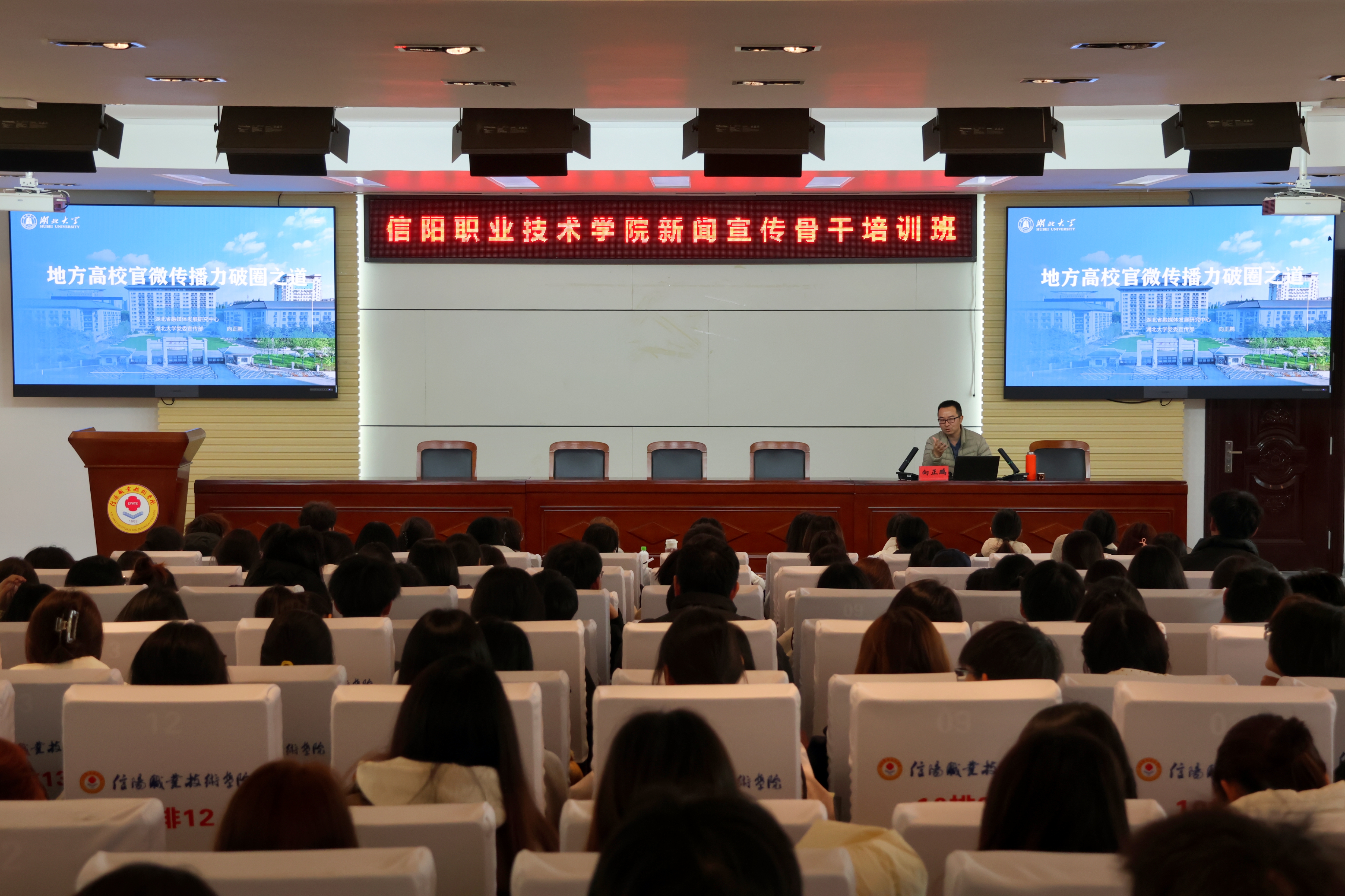 12月8日下午,我校新闻宣传骨干培训班顺利举行。本次培训特别邀请到湖北大学党委宣传部向正鹏老师担任主讲人,围绕高校新闻宣传工作的核心议题,为全校200余名新闻宣传骨干带来了一场内容翔实、实用性强的经验分享会。