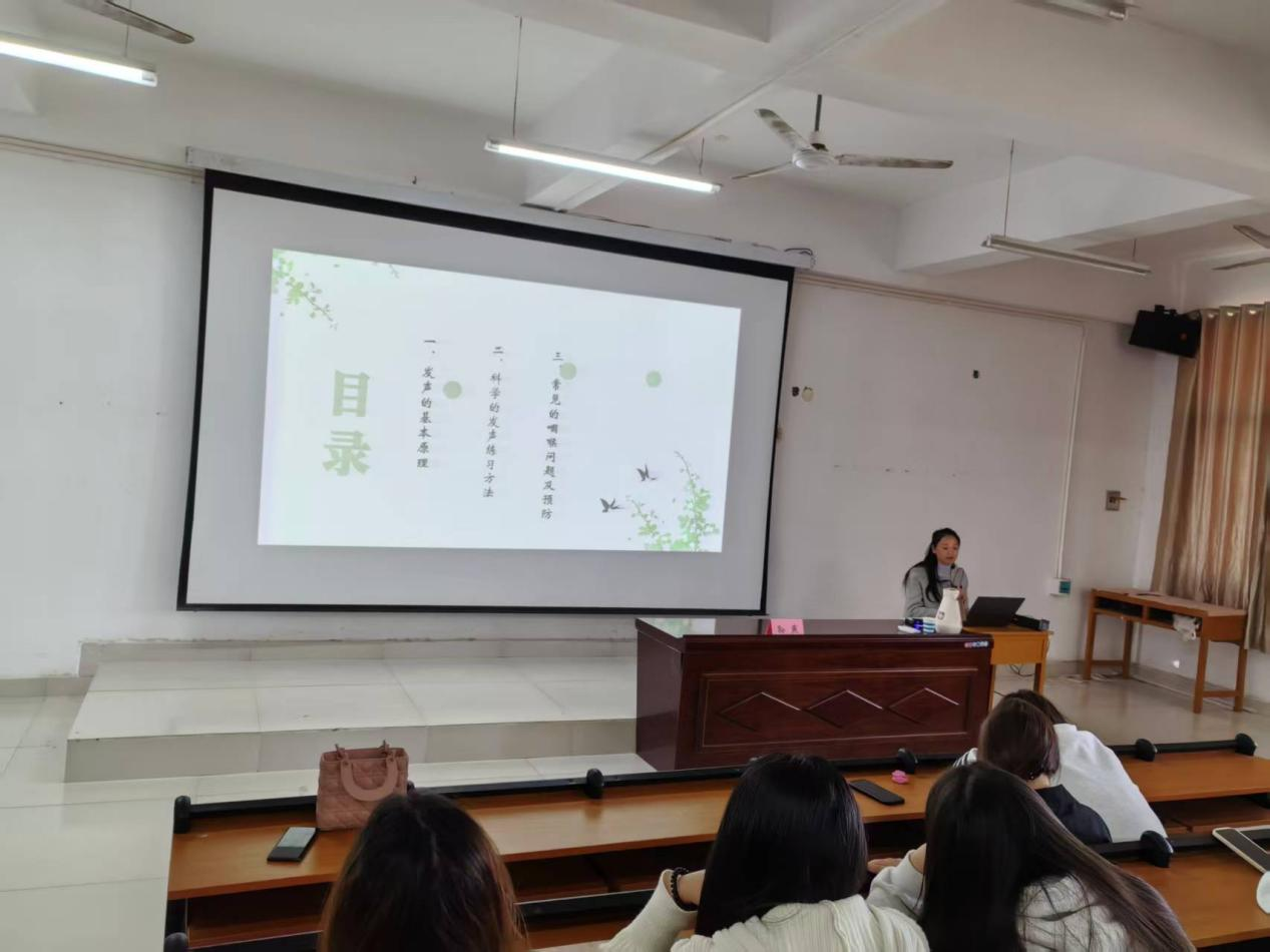 在科学发声技巧部分,孙老师针对日常用声中常见的问题,分享了气息控制、喉部放松、共鸣运用等实用方法。她强调,合理用声不仅能提升表达效果,更能保护嗓子,并通过简单易操作的发声练习,引导现场师生亲身实践,感受科学用声带来的变化。互动环节中,孙老师耐心解答大家的疑问,针对个别同学的发音问题进行精准指导,让每个人都能获得针对性的提升建议。